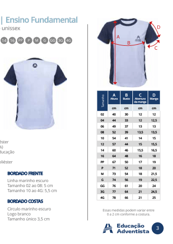 AAlturaBBustoC Abertura da mangaDMangacm cm cm cm02 40 30 12 1204 44 33 12 12,506 49 37 13 1308 52 39 13,5 13,510 54 41 14 1512 57 44 15 15,514 60 46 15,5 16,516 64 48 16 18PP 67 50 17 19P 71 52 18 20M 73 54 18 21,5G 74 56 19 22,5GG 76 61 20 243G 77 64 21 24,54G 78 66 21 253