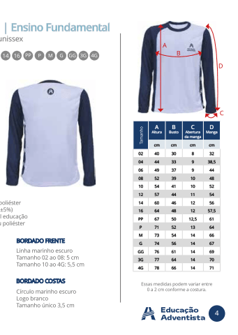 AAlturaBBustoC Abertura da mangaDMangacm cm cm cm02 40 30 8 3204 44 33 9 38,506 49 37 9 4408 52 39 10 4810 54 41 10 5212 57 44 11 5414 60 46 12 5616 64 48 12 57,5PP 67 50 12,5 61P 71 52 13 64M 73 54 14 66G 74 56 14 67GG 76 61 14 693G 77 64 14 704G 78 66 14 714