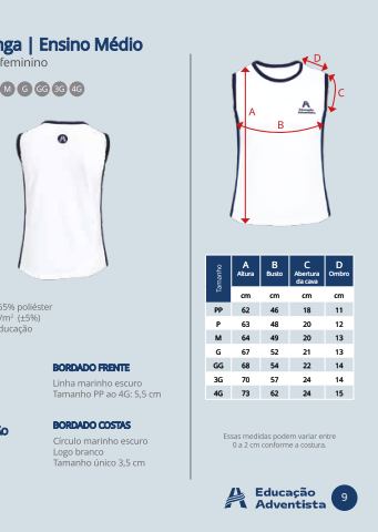 AAlturaBBustoC Abertura da cavaDOmbrocm cm cm cmPP 62 46 18 11P 63 48 20 12M 64 49 20 13G 67 52 21 13GG 68 54 22 143G 70 57 24 144G 73 62 24 159
