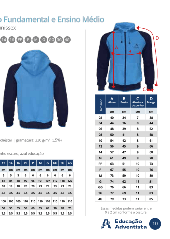 AAlturaBBustoC Abertura do punhoDMangacm cm cm cm02 40 34 7 3804 44 36 8 4406 48 39 8 5208 50 41 8 5810 54 42 8 6112 56 45 9 6614 57 47 9 6816 61 49 9 70PP 63 51 10 73P 67 55 10 76M 73 59 10 80G 74 62 11 81GG 76 66 11 833G 77 69 11 834G 79 73 11 8512 14 16 PP P M G GG 3G 4Gcm cm cm cm cm cm cm cm cm cm5 5 5 6 6 6 6 6 6 681 84 88 90 96 101 107 112 118 12018 18 18 20 20 23 23 23 23 233,5 3,5 3,5 3,5 3,5 3,5 3,5 3,5 3,5 3,5100 100 100 110 110 110 110 110 110 11050 50 55 55 60 65 65 70 70 705,5 5,5 5,5 5,5 5,5 5,5 5,5 5,5 5,5 5,510