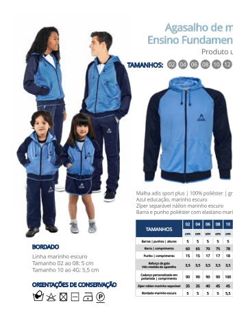 TAMANHOS02 04 06 08 10 cm cm cm cm cm Barras | punhos | alturas 5 5 5 5 5 Barra | comprimento 60 65 70 75 78 Punho | comprimento 15 15 17 17 18 Refor%u00e7o de gola Vi%u00e9s medida do aparelho 3,5 3,5 3,5 3,5 3,5 Cadar%u00e7o personalizado em poliamida | comprimento 90 90 90 90 100 Z%u00edper n%u00e1ilon marinho separ%u00e1vel 35 35 40 45 45 Bordado marinho escuro 5 5 5 5 5,5