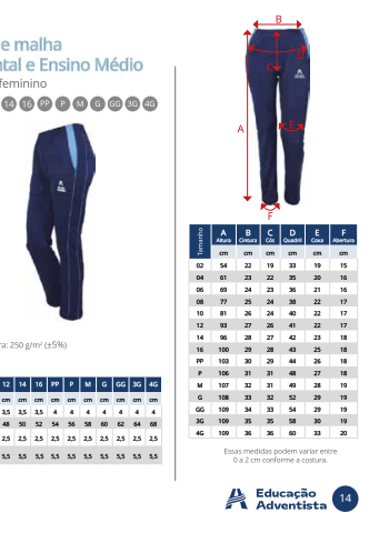 AAlturaBCinturaCC%u00f3sDQuadrilECoxaF Aberturacm cm cm cm cm cm02 54 22 19 33 19 1504 61 23 22 35 20 1606 69 24 23 36 21 1608 77 25 24 38 22 1710 81 26 24 40 22 1712 93 27 26 41 22 1714 96 28 27 42 23 1816 100 29 28 43 25 18PP 103 30 29 44 26 18P 106 31 31 48 27 18M 107 32 31 49 28 19G 108 33 32 52 29 19GG 109 34 33 54 29 193G 109 35 35 58 30 194G 109 36 36 60 33 2012 14 16 PP P M G GG 3G 4Gcm cm cm cm cm cm cm cm cm cm3,5 3,5 3,5 4 4 4 4 4 4 448 50 52 54 56 58 60 62 64 682,5 2,5 2,5 2,5 2,5 2,5 2,5 2,5 2,5 2,55,5 5,5 5,5 5,5 5,5 5,5 5,5 5,5 5,5 5,514